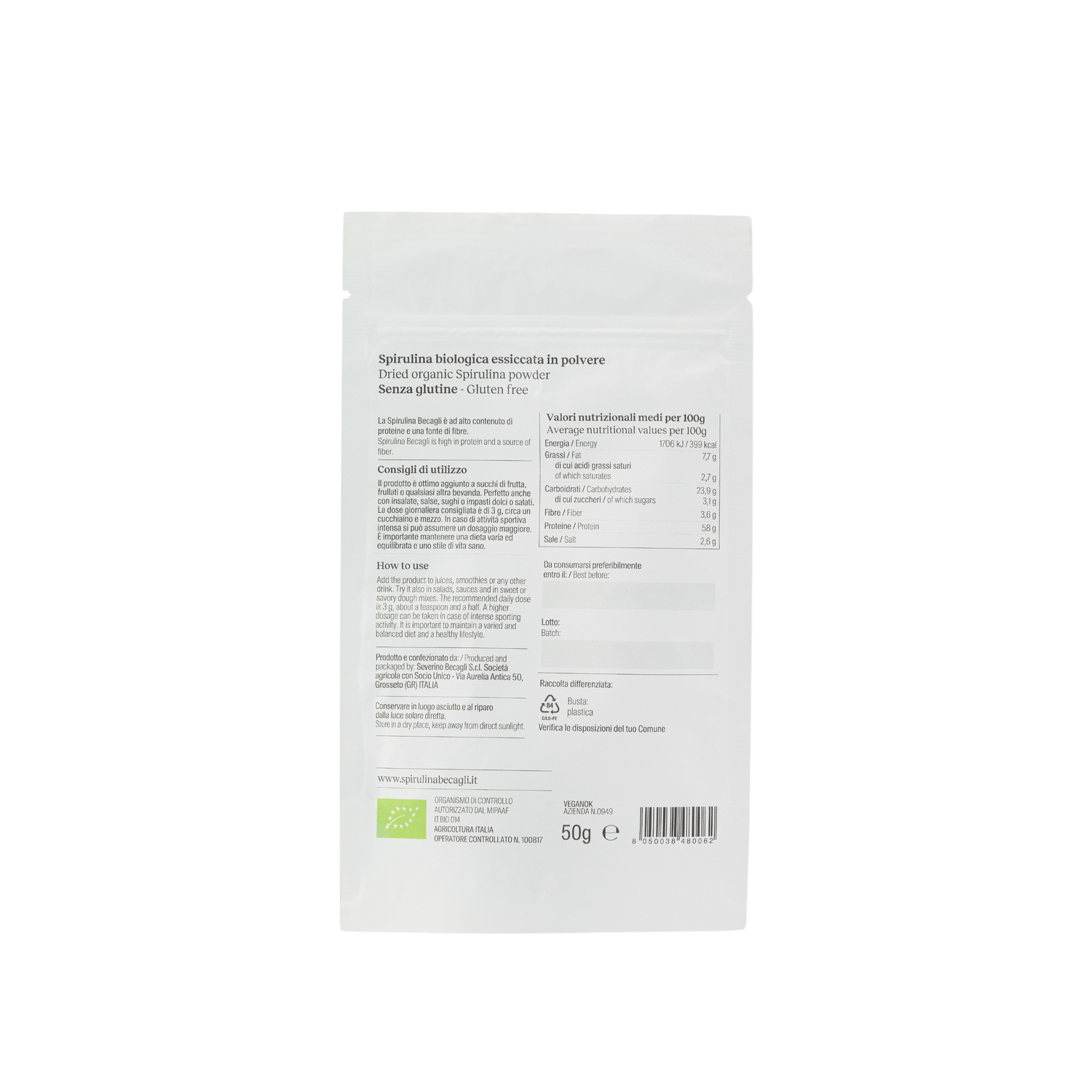 Spirulina in polvere è registrata al Ministero Italiano della Salute come integratore alimentare, e in quanto integratore non va intesa come sostituto di un pasto all’interno di una dieta variata, equilibrata e di uno stile di vita sano.
